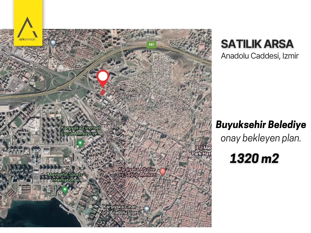 Izmir, Anadolu Caddesi uzerinde, ARKAS Otomativ karsisi, VOLKAR Volvo yaninda, 1320m2 ticari imarli arsa.